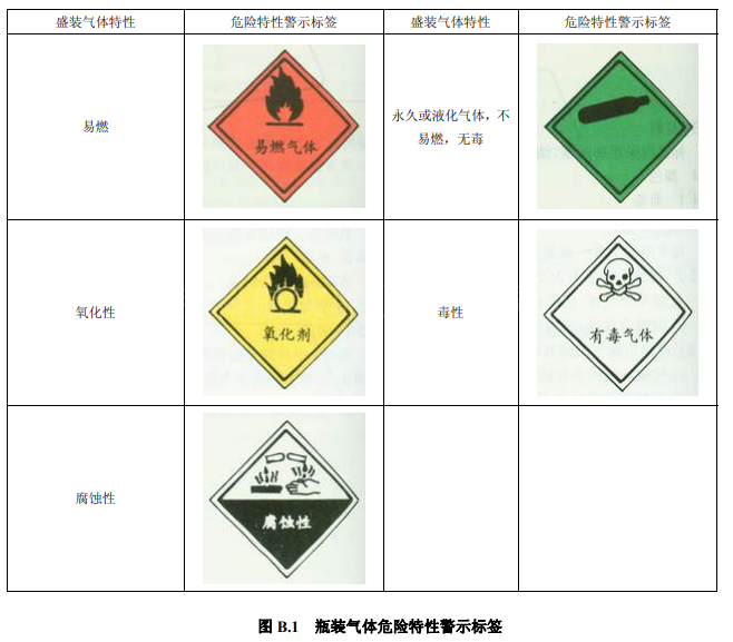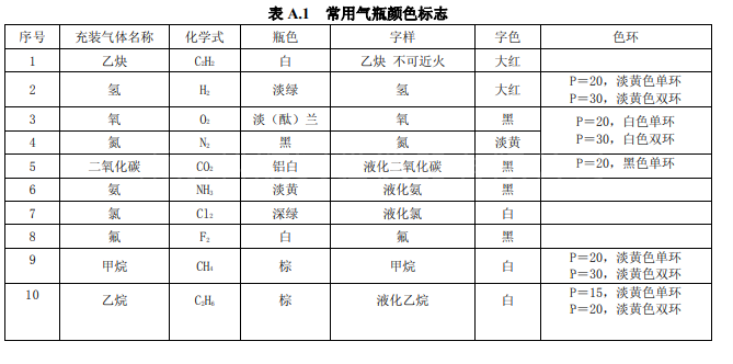 3、对气瓶的检查主要包括以下方面:- 气瓶是否有清晰可见的外表涂色和警示标签。气瓶颜色应满足 GB7144-1999-的要求,警示标签应满足GB16804-1997的要求。常见气瓶颜色标志见表A.1,瓶装气体危险特性警示标签参见表B.1;
