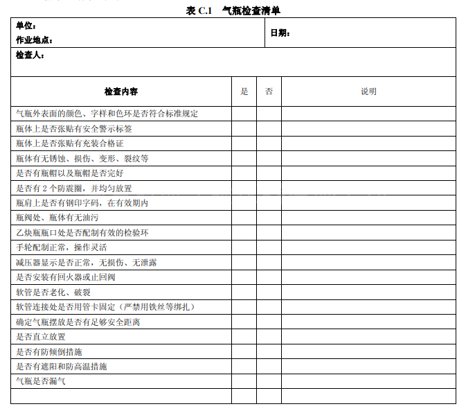 - 气瓶的使用状态(满瓶、使用中、空瓶)。 气瓶检查清单参见表C.1。