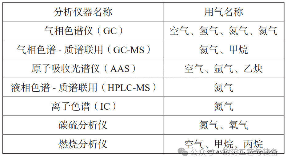(3)分析用气:为保证压力稳定和气体纯度,一般采用钢瓶供气。常用的分析实验类别和用气类型见表1。