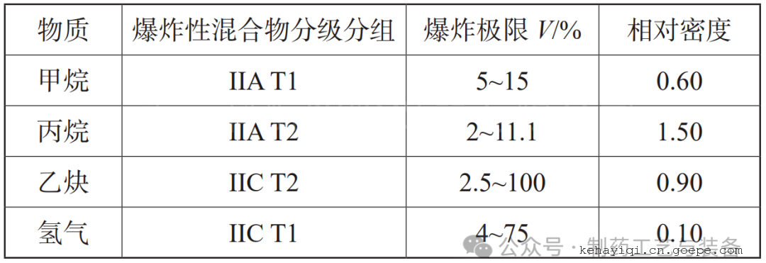 可 能 有 可 燃 气 体 释 放 的 区 域,应 该 根 据 GB50058—2014《爆炸危险环境电力装置设计规范》划分爆炸性危险区域,并根据危险区域划分图指导区域内的电气设计,选用合适的电气设备,包括配电箱、接线箱、插座、灯具、探头、仪表等。尤其是有快拆接口、法兰处需进行此考虑,焊接管道不视为释放源。气瓶拆装处、气体放散口、安全阀泄放点等区域可能需考虑为二级释放源,建议进行爆炸危险性区域划分。实验室常用的可燃气体分级见表2[2],相关的电气防爆设计以此为依据 :