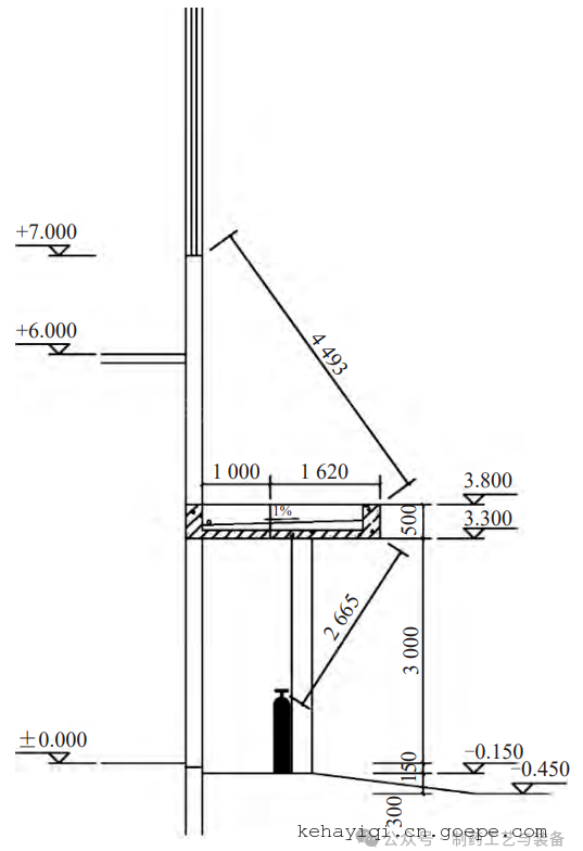 根据各类常用可燃气体的特点,可知一般爆炸性危险 2 区划分,在平面上一般需要半径 4.5 m,立面上根据气体类型不同,4.5 m 或 7.5 m 不等。在平面布置设计中,首先需要确定释放源。如果能固定气瓶摆放的位置,可以以气瓶出口和汇流排等主要的阀门、法兰、快接口为释放源点。但实际生产中往往会出现更换气瓶、检修等情况,气瓶间内也需要考虑空瓶的暂时堆放,而此“空瓶”只是压力不满足使用需求,仍然有泄漏的风险。因此,一般以气瓶间的栅栏为释放源的边界,划定爆炸危险性区域平面范围。确定爆炸危险性区域后,应避免将相邻的室内房间划入爆炸危险性区域,否则会增加不必要的成本。平面布置上,在 4.5 m 半径范围内不宜有门、窗、墙孔。在立面布置上,根据可燃气体密度的不同,从释放源向上的 4.5 m 或 7.5 m,也不宜开窗或开墙孔。如果开窗,窗台高度需要超出爆炸性危险性区域的范围。在某设计实例中,一层层高为 6 m,二层窗台高1 m,假定气瓶出口高度为 1.2 m,考虑到室内外高差后,与窗台高差仅为 6.35 m,当放置甲烷气体钢瓶时,二层房间将被划进爆炸性危险 2 区范围。因此采用了出挑混凝土结构雨蓬的方法,如图5 所示,设置雨蓬后,即使气瓶沿气瓶间栅栏外侧放置,气瓶出口到二层窗户的距离为 2.665 + 0.5 + 4.493 = 7.658 m,超过了 7.5 m 的范围,避免将爆炸性危险区影响二层。但采用此方法时,需要注意采取措施,避免氢气等轻质可燃气体在雨蓬下积聚。