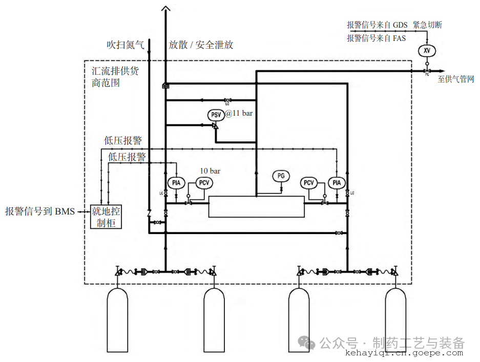 对于钢瓶供气设施,一般采用汇流排的形式,对多个气瓶(或杜瓦瓶等)进行集中减压,确保供气的持续稳定。一个典型的气瓶汇流排设计如图6所示。典型的汇流排设计应具有减压、安全阀、吹扫阀、(半)自动切换和低压报警等功能。
