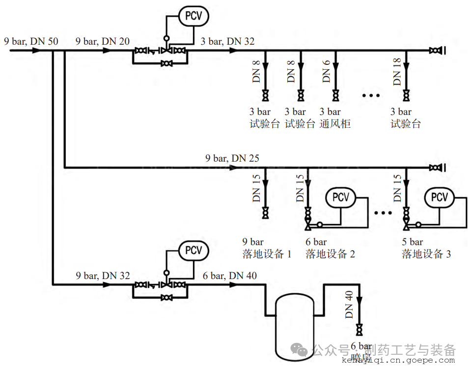 (3)从减少减压阀数量的角度出发,如果某区域有较多需求同一压力的使用点,可以共用一组减压阀直接减到所需压力。但如果某区域有较多不同压力的使用点,则需要主管压力满足*高的使用点压力需求,在末端分别减压。实际设计中,可以将这两种思路结合起来;