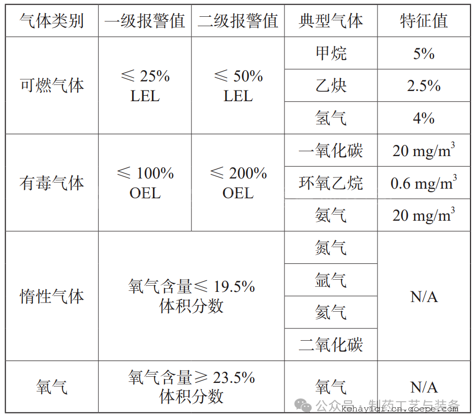 (3)气体使用点。根据 GB/T 50493—2019 《石油化工可燃气体和有毒气体检测报警设计标准》,常见类别气体的报警值设定见表3 [3],可燃气体和有毒气体的参考特征值分别按爆炸下限(LEL)和职业接触限制确定(OEL),实际设计中可根据需求,降低报警限制,提高灵敏度。