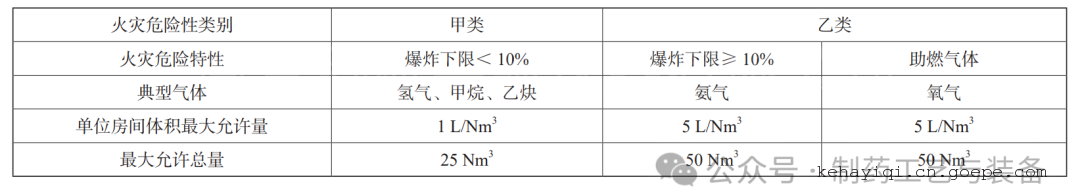 消防安全定性难点研讨 涉及可燃气的使用需求时,在消防安全定性方面主要受到两部规范的限制: 《建筑设计防护规范》规定,当易燃、助燃类气体的用量不超过限值时,方可不定义为甲乙类生产区,与气体相关条目如表4 所示[2]。